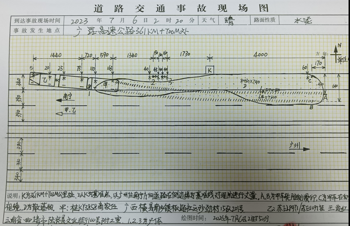 在现场甲车后方广州往南宁方向的右侧行车道上有甲车轮胎的侧滑印A、B。其中A、B起点至基准线的距离分别为430cm、640cm。A起点至B起点的垂直距离为170cm。A起点至基准线的垂直距离为4000cm。A、B的长度分别为7480cm、7310cm。现场甲车后方应急车道内遗留有甲车右侧后视镜C,C至基准线的距离为60cm。D为散落物,散落物为甲、乙两车零部件及车上物品,散落物面积为8430cm×740cm。