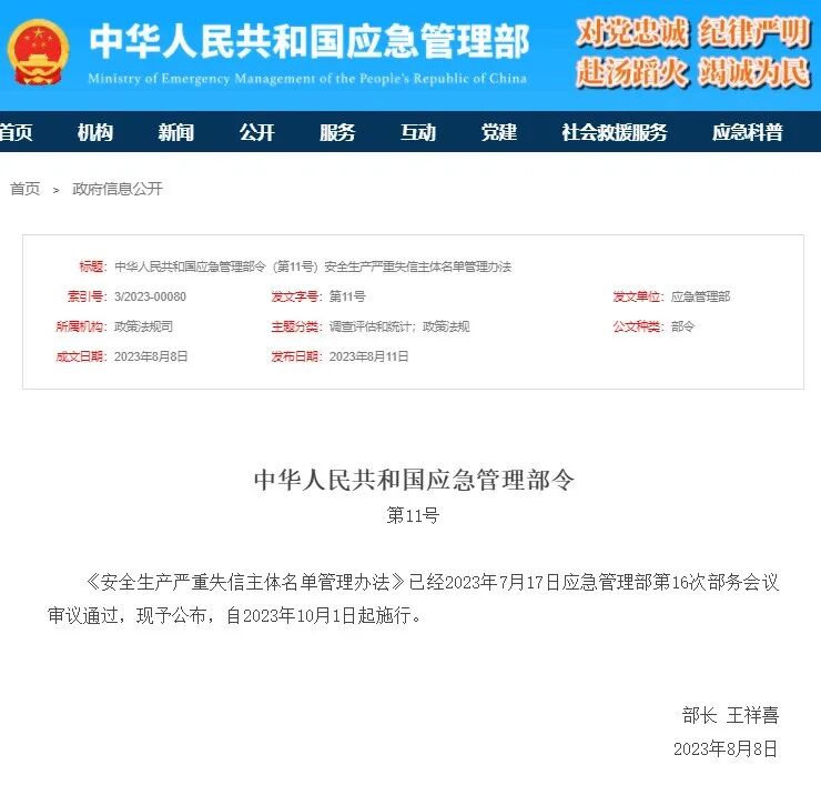《安全生产严重失信主体名单管理办法》已经2023年7月17日应急管理部第16次部务会议审议通过,现予公布,自2023年10月1日起施行。