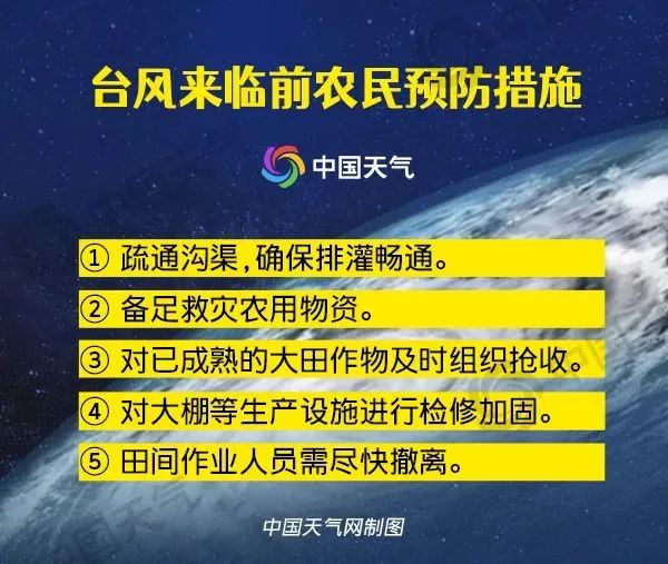 农民朋友在台风消息发布后,对可能遭受台风袭击、发生洪涝灾害的地方早作准备,及时采取防灾避灾措施。对大田作物来说需疏通沟渠,开好田间排水沟,确保排灌畅通;备足救灾农用物资;对水稻、玉米、大豆、瓜菜等大田作物已成熟的,及时组织抢收;对大棚等生产设施进行检修加固,同时及时组织田间作业人员撤离。
