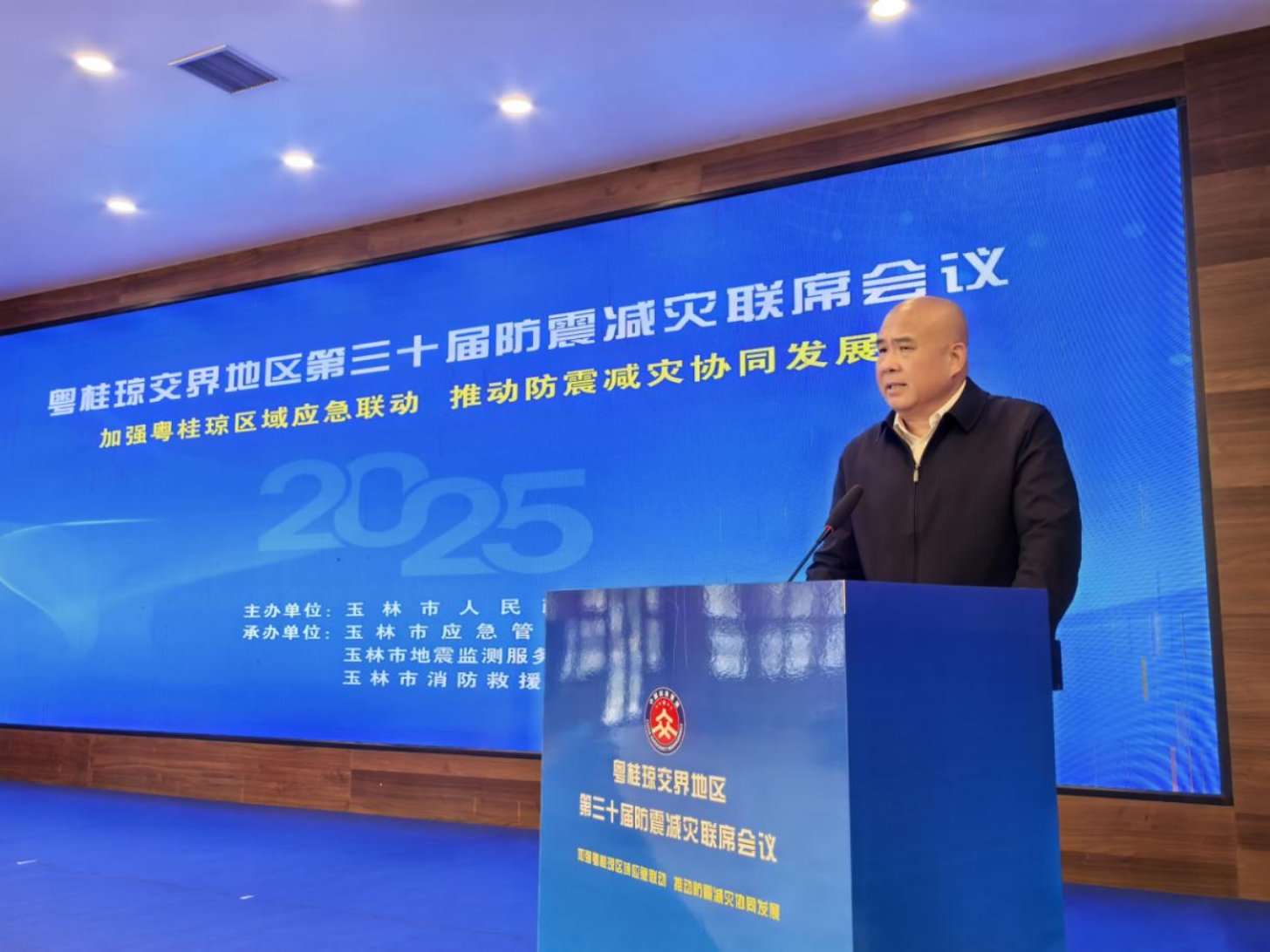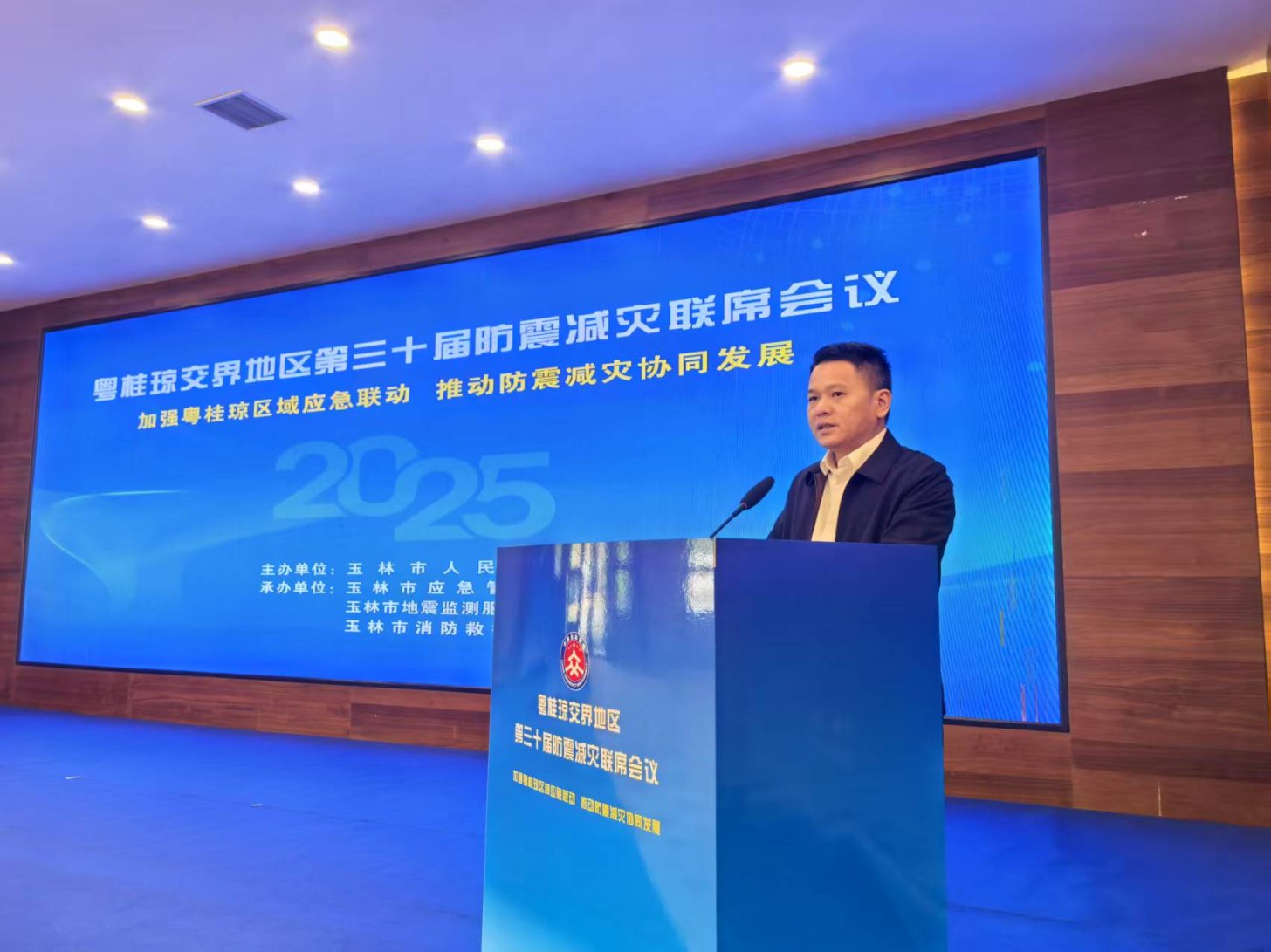 玉林市委常委、常务副市长韦庆强到会指导,并致辞。韦庆强指出,作为粤桂琼交界地区的重要城市,玉林始终全面贯彻习近平总书记关于防灾减灾救灾和提高自然灾害防治能力的重要论述,编制抗震救灾职责任务清单,压实防震减灾责任,提升地震预报预警能力,加强自然灾害实战演练,深化跨区域应急管理合作,不断提升基层防灾减灾能力和公众避险意识,全市防震减灾工作成效持续显现。通过本届联席会议的深入研讨和务实交流,必将进一步推动三省(区)在监测预警、应急响应、风险防治等领域的深度融合,共同提升区域地震安全治理体系和治理能力现代化水平,为粤桂琼交界地区经济社会高质量发展和人民生命财产安全提供更加坚实可靠的保障。
