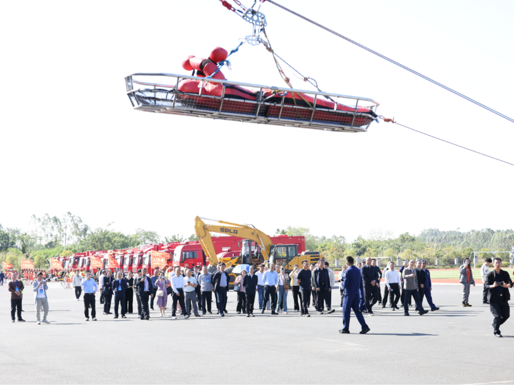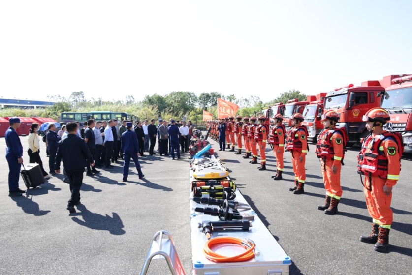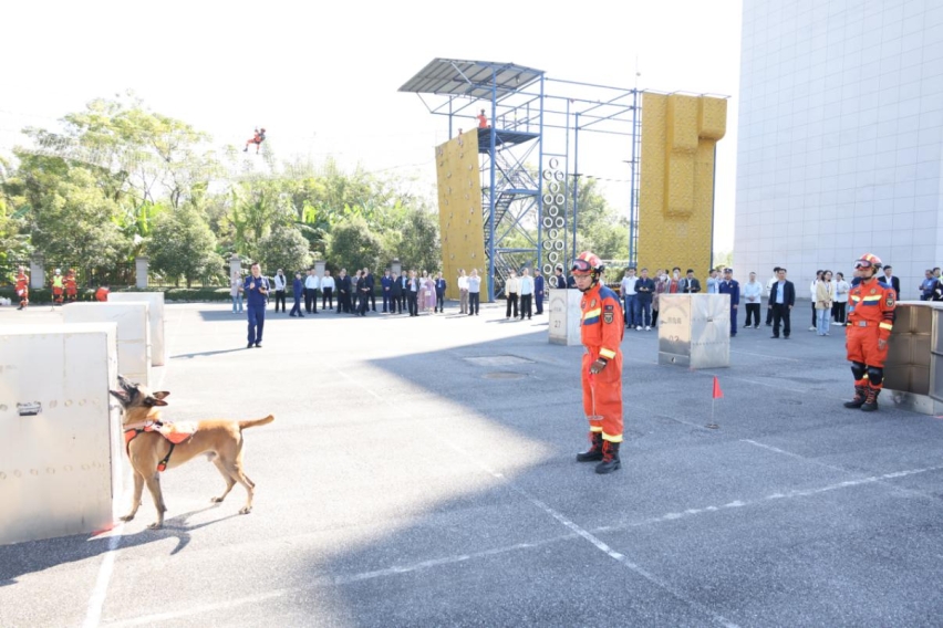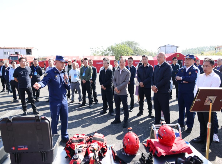 ▲与会人员在玉林市消防训练基地现场调研交流防震减灾工作,观摩地震救灾演练。