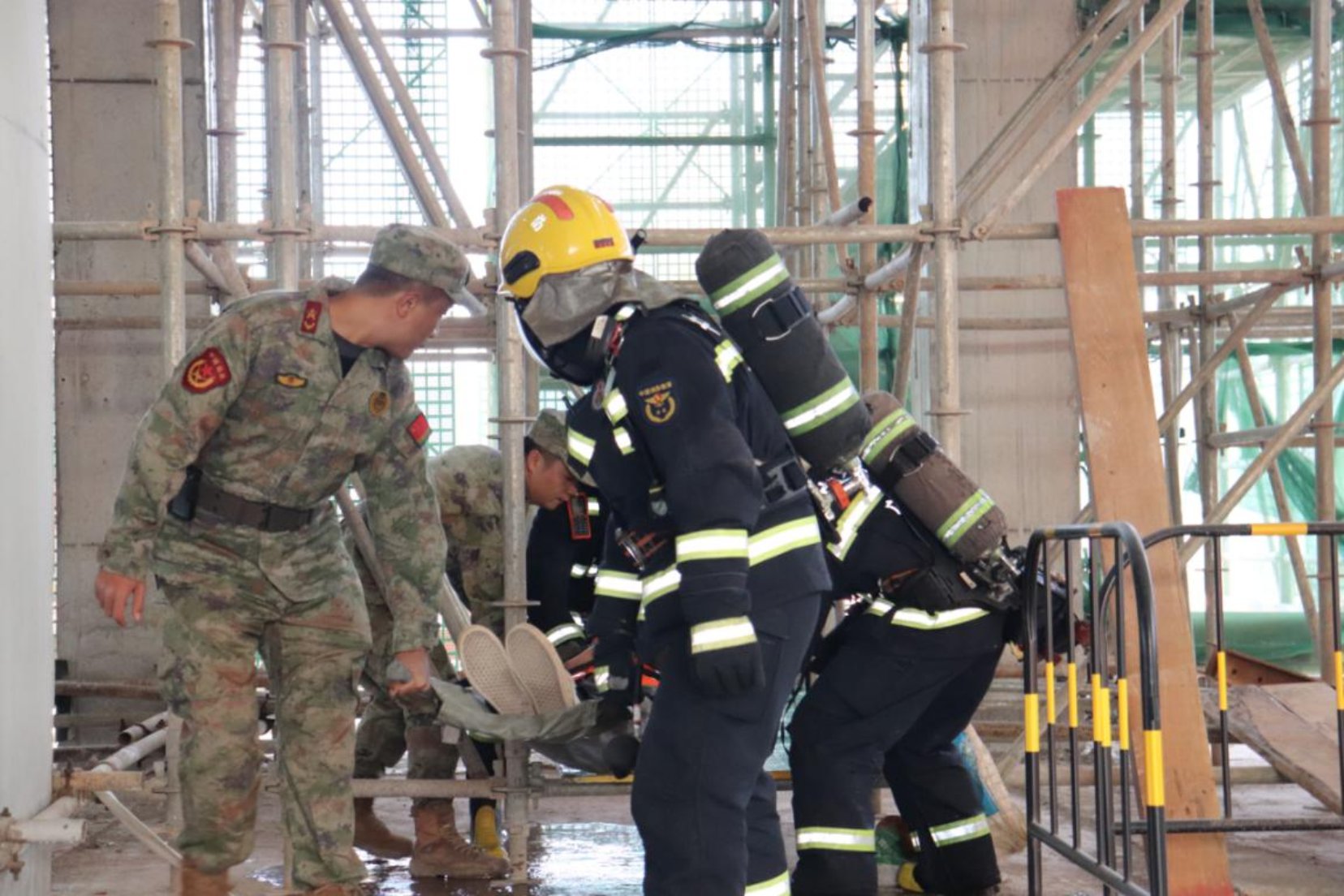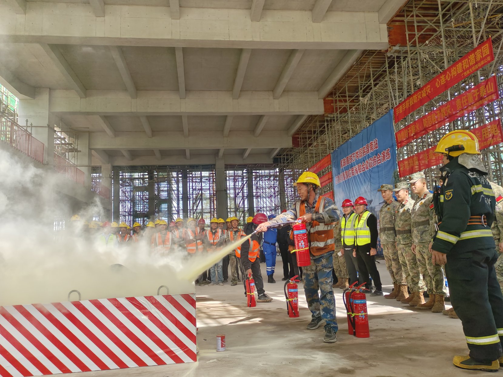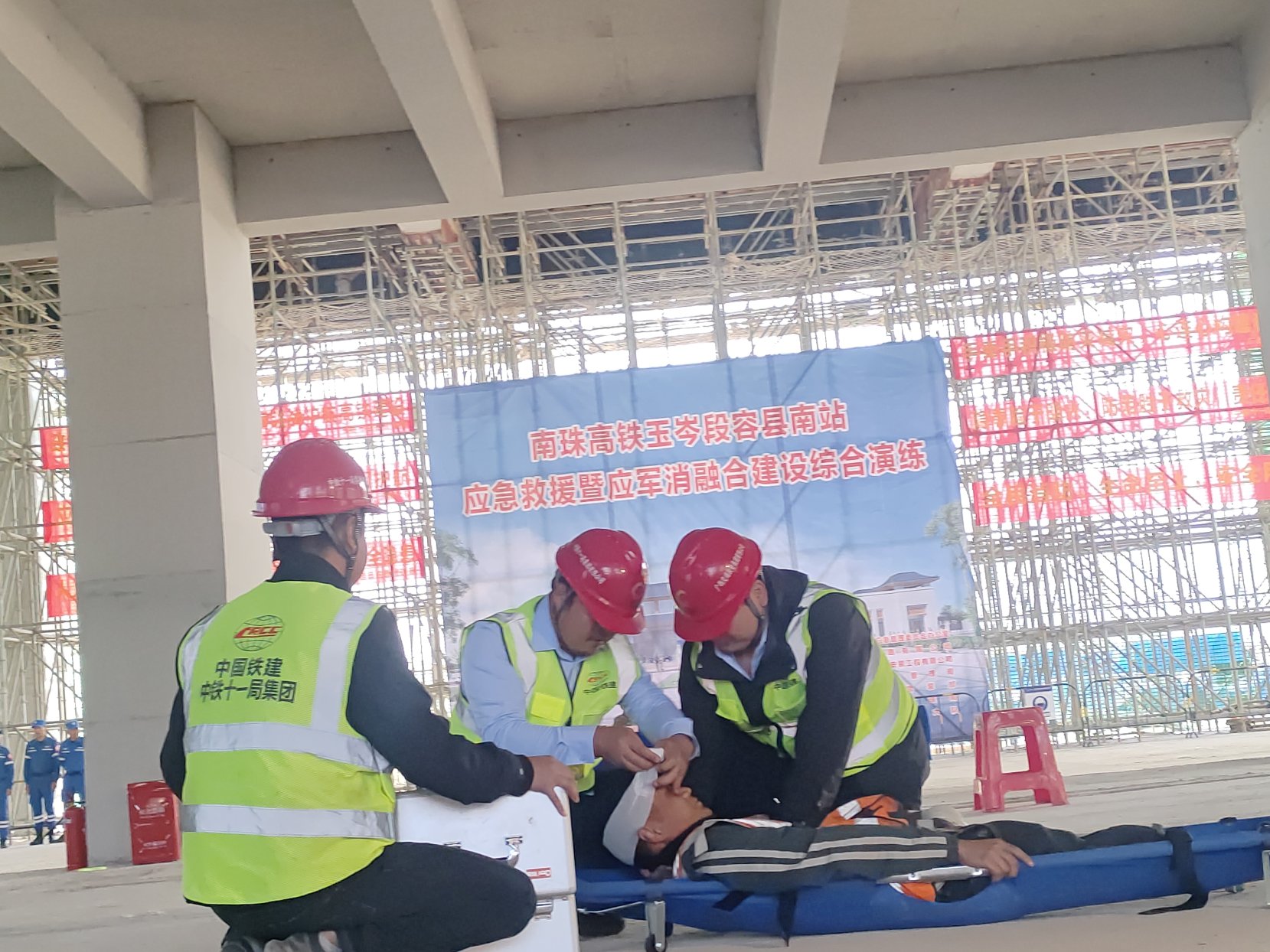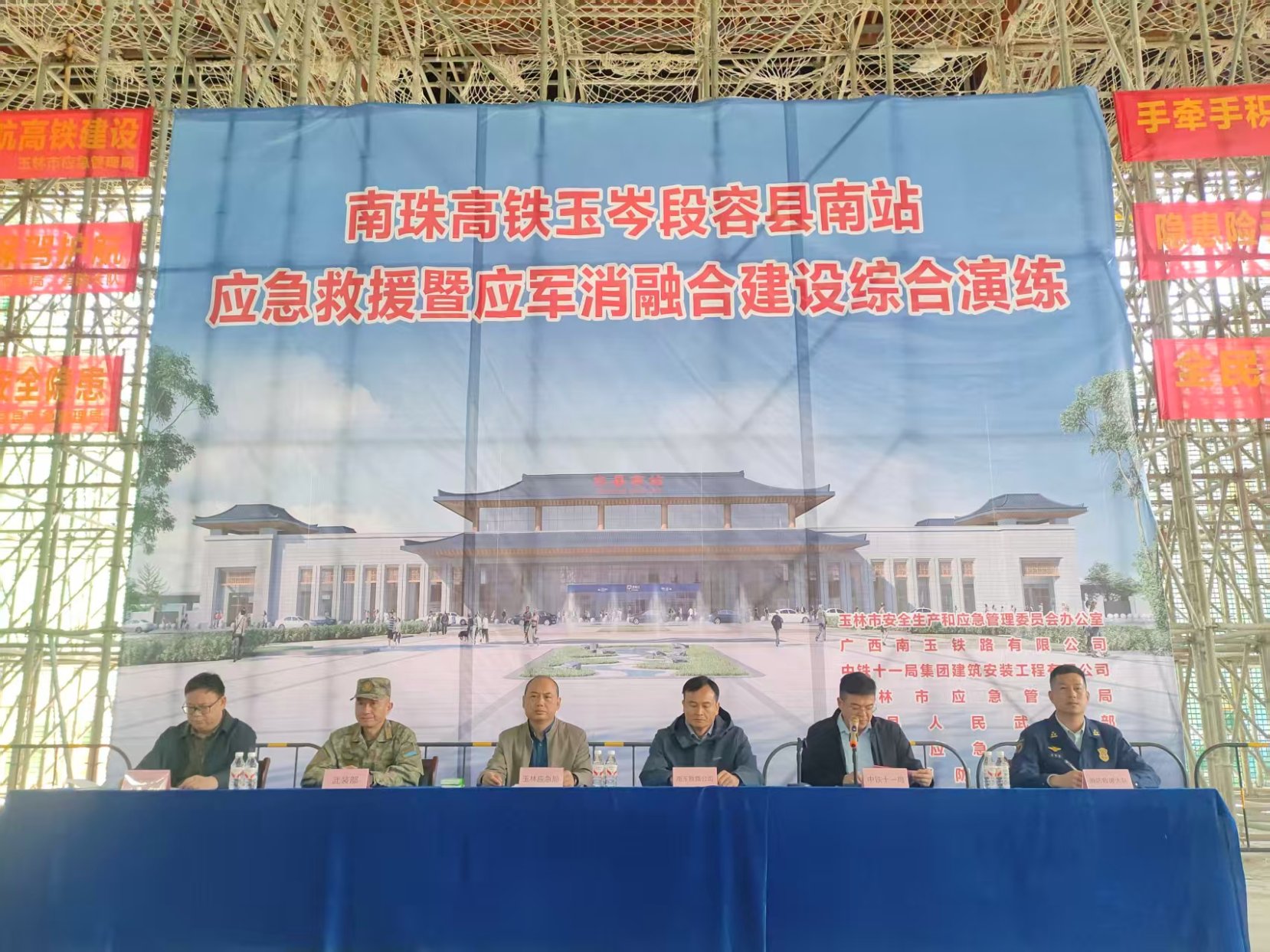 11月27日上午,市安全生产和应急管理委员会办公室在容县南站建设现场举行南珠高铁玉岑段容县南站应急救援暨应军消救援力量融合建设综合演练,市应急管理局、容县安应办、南玉铁路公司、中铁十一局建安公司南珠高铁玉岑段容县南站项目部、容县人武部、容县消防救援大队、容县红十字会等9个单位150多人参加演练。演练重点围绕应急救援队伍快速处置、企业员工自救互救、应军消救援力量融合建设、火灾防范和处置以及应急救护技能培训等6个科目开展。
