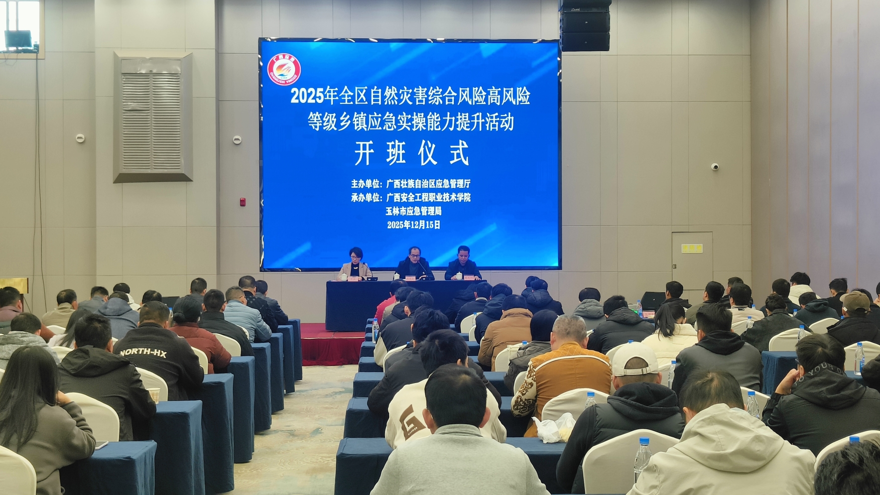 12月15日至16日,由自治区应急管理厅主办,广西安全工程职业技术学院、玉林市应急管理局共同承办的2025年玉林市自然灾害综合风险高风险等级乡镇应急实操能力提升活动在玉林城区成功举办。来自北流市、玉州区10个高风险等级乡镇(街道)分管应急管理工作的领导或专职工作人员,以及下辖村(社区)干部共126人参加培训。