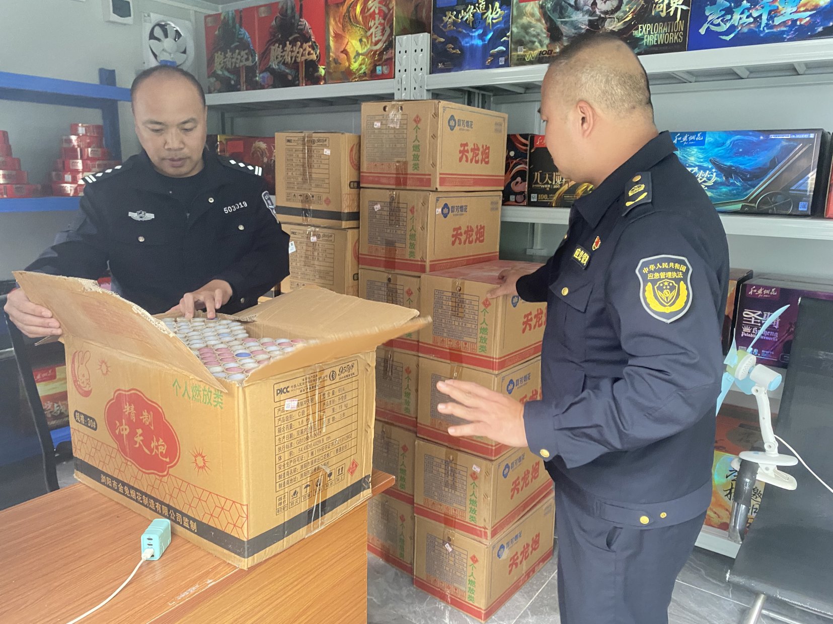 案例4:2025年12月23日,玉州区应急管理局治爆大队联合玉林市公安局玉州分局城北派出所开展打击非法储存烟花爆竹行为,并接收相关查获的非法储存的烟花爆竹,经现场清点,各类零散烟花24箱(件),已暂存原富海烟花爆竹公司仓库,择期再进行安全销毁。