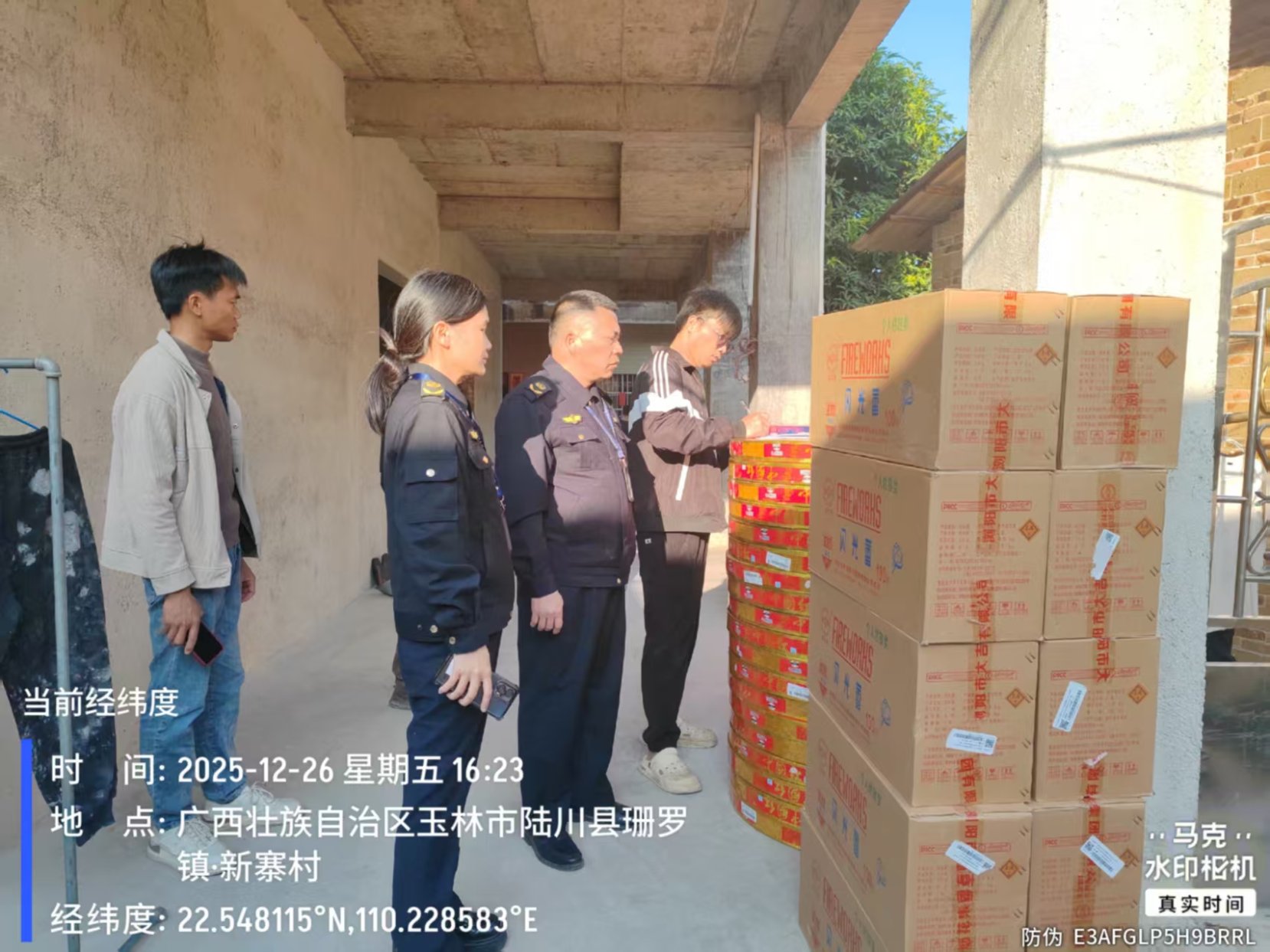 案例9:2025年12月26日,陆川县应急管理局接群众举报称珊罗镇新寨村某居民房内疑似存在非法经营储存烟花爆竹行为,遂联合陆川县公安局、珊罗镇政府到现场核查。经查,在新寨村林某房屋内发现非法储存烟花爆竹产品84件,该批产品无流向标识,来源不明,现场无安全设施设备,存在安全隐患。为消除安全隐患,陆川县应急管理局依法对该批烟花爆竹产品扣押,案件正在进一步调查中。