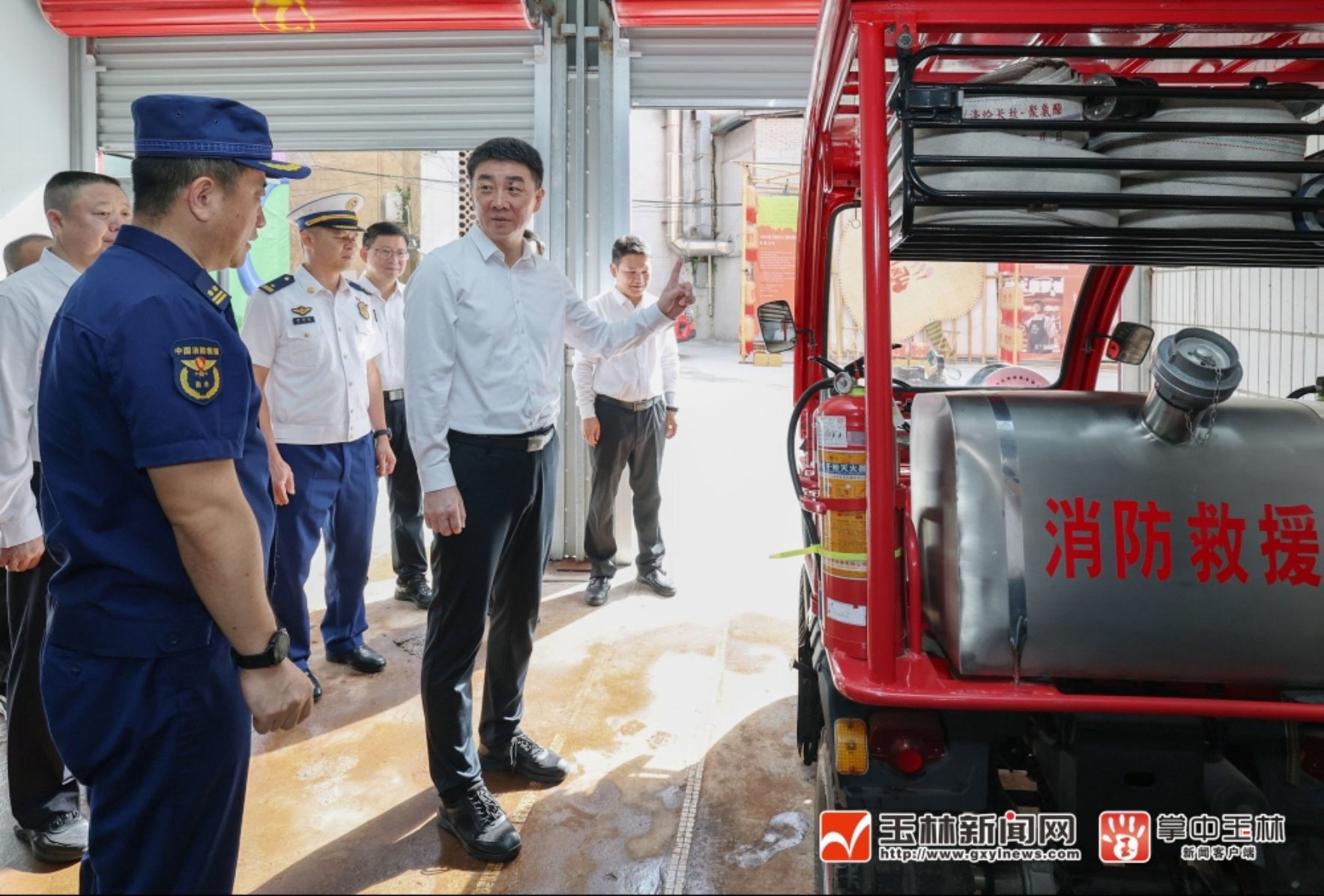 ▲2025年9月30日,市委书记王琛在玉林城区检查国庆中秋假期安全稳定、物资供应等工作。图为王琛在玉林十字街执勤点察看相关消防设备,听取有关情况介绍。