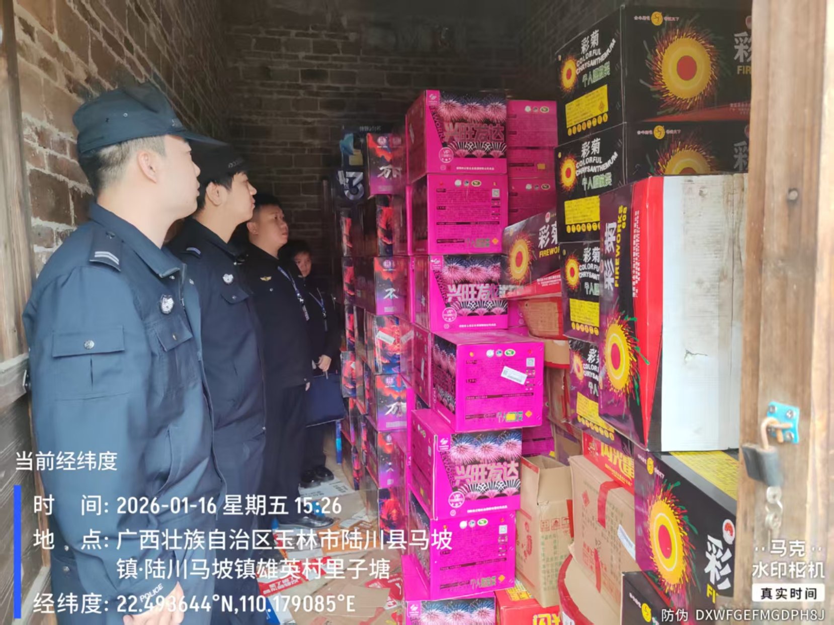2026年1月8日,玉林高新区规划建设和应急管理部根据群众举报线索,并经过两次现场核查,在茂林镇永安村(禁燃区)某自建房内发现并收缴非法储存烟花产品4箱(件)。