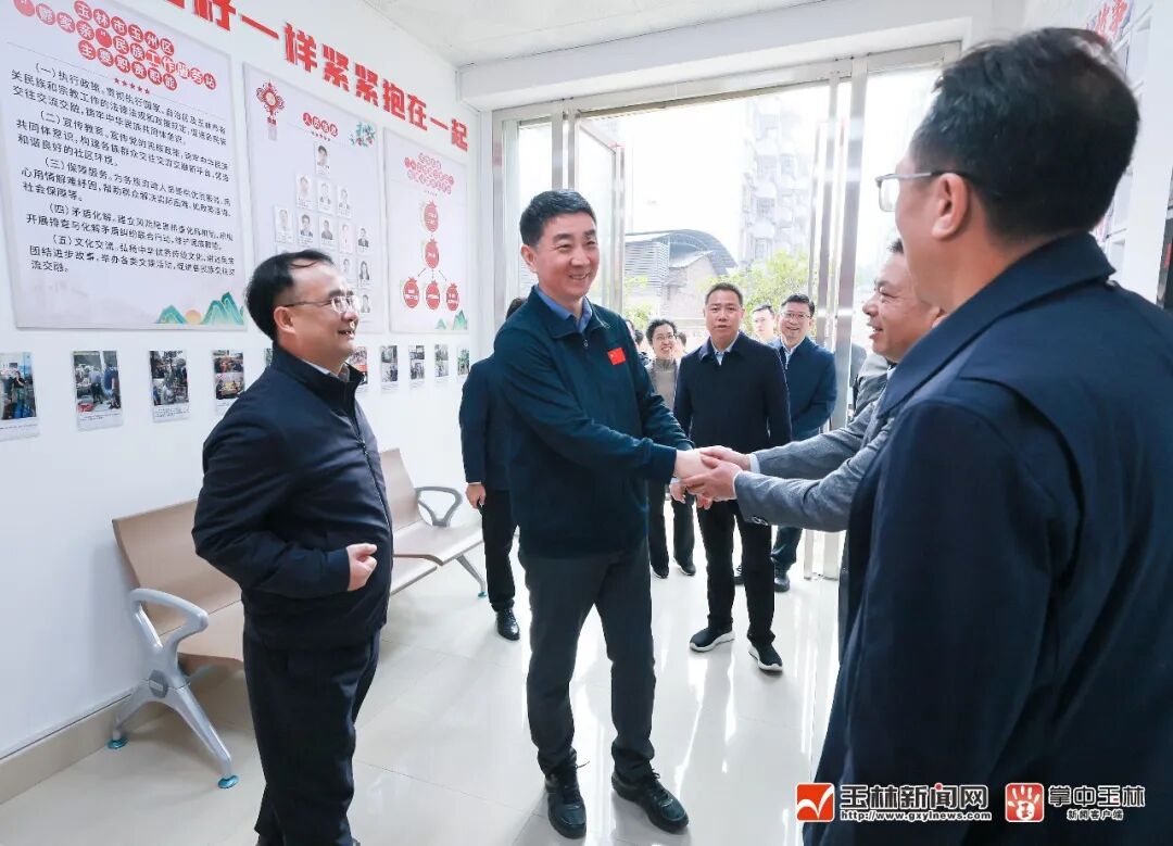 在南江街道镇忠社区,王琛走进党群服务中心、“鬱家亲”民族工作服务站,详细了解党建引领基层高效能治理等工作情况,对取得的成效给予肯定。他强调,要加强基层党建,发挥网格作用,强化AI赋能,及时消除各类风险隐患,持续提升基层治理效能,把工作做到群众心坎上,让群众有更多获得感、幸福感、安全感。要以铸牢中华民族共同体意识为主线,坚持五湖四海、一视同仁,来了就是玉林人,推动民族工作与经济社会发展深度融合,形成各民族共同团结奋斗、共同繁荣发展的生动局面。王琛走进“鬱家亲”民族工作服务站了解有关情况。